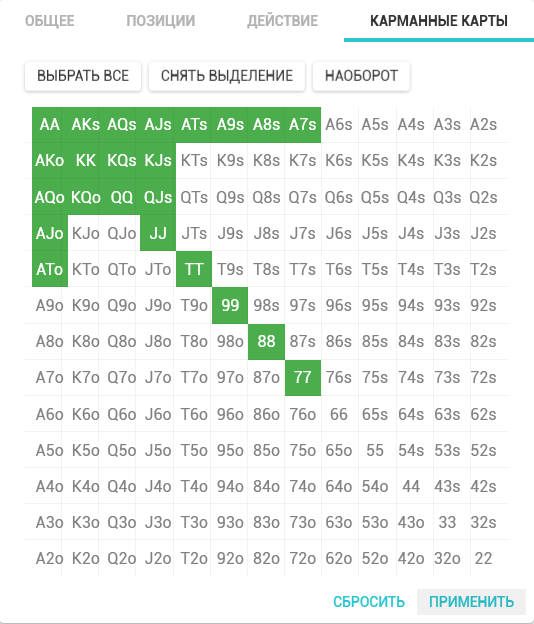 Из всего вышеперечисленного на ривере можем оставить только 99/QQ/KK/AKs/AKo