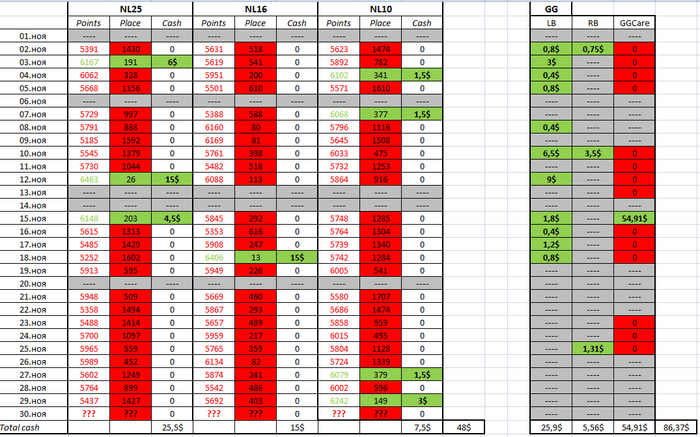 Конечно же, полностью не думать о покере не вышло. Но румы до ноября не открывал. По месяцу профит вышел в районе баксов 300 - RBC, ЛБ, сундуки. Со столов около нуля. Конкретно уже не посчитать(