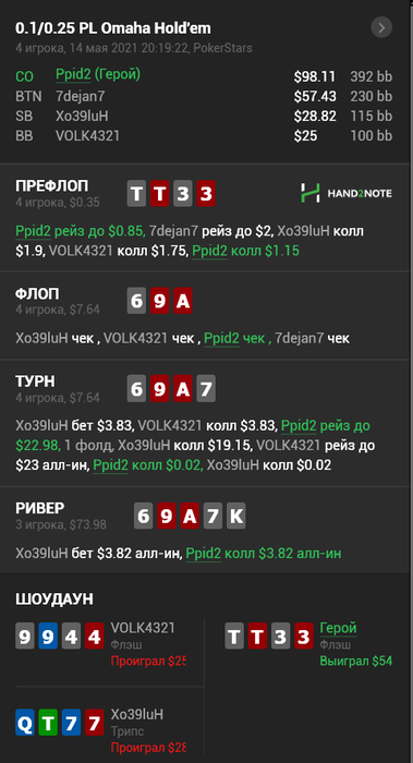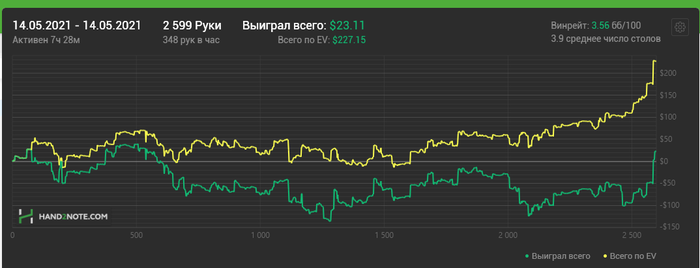 Начал с -100 за 400 рук, напихали классически