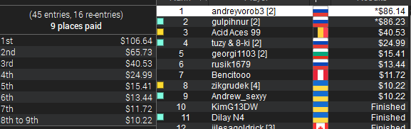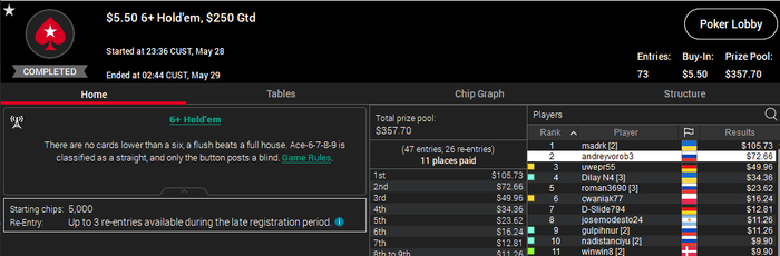 Еще топ 3 было в 6 часавом шортдеке по 5$, но там призы слишком маленькие были)