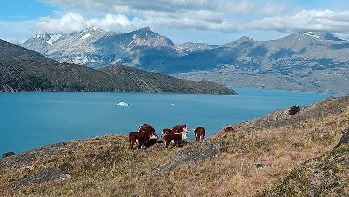 А на перевале офигенно: нет ветра, вид на ледник O’Higgins и с десяток коров. Пугаются нас и убегают - хорошо, значит они домашние.