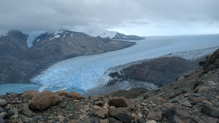Тобиаса забирают с одинокого камня и всех вместе забрасывают к соседнему леднику Gaia, который ещё каких-то 50 лет назад был частью большого ледника O’Higgins, но отступая, обнажил крутые скалы и сыпухи, по последним нам и надо набрать 1000 метров на перевал. Здесь мудрые гид с женой нас оставляют и уплывают.