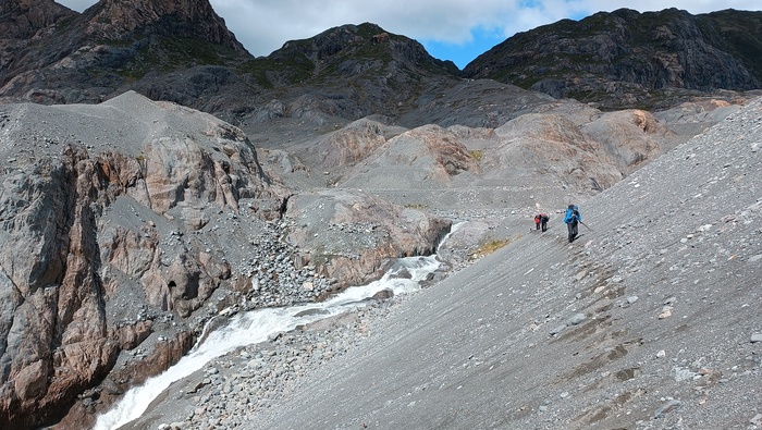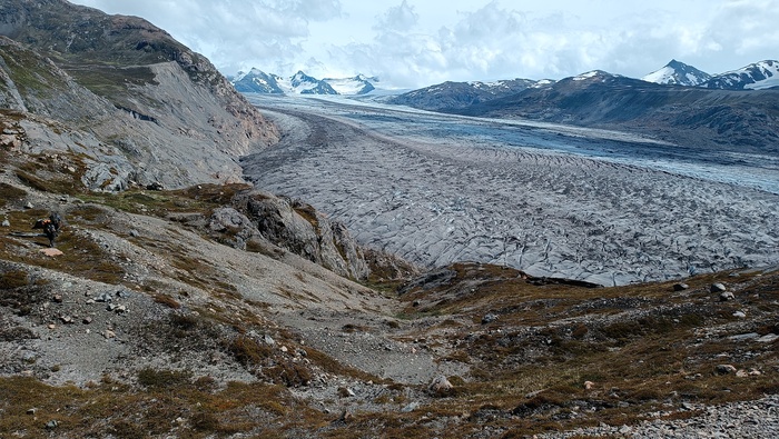 Мы выдвигаемся по морене отступившего ледника к озеру, которое предстоит сегодня её переплывать.