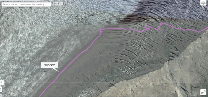 Он кстати не везде “грязный” и в центре идеально белый. Наверное это связано с разницей в температурах в разных частях ледника - новые осадки в центре не успевают растаять до уровня вулканического песка и/или в центре под давлением больших масс ледник движется быстрее чем по бокам.