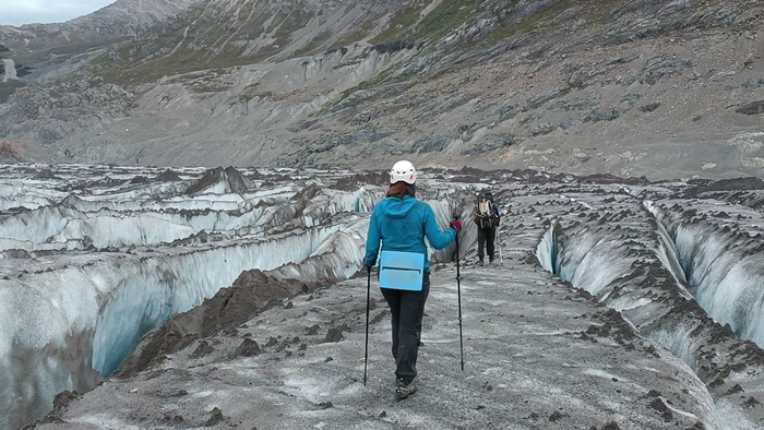 Ледник Chico - грязный от вулканического пепла, в переводе означает “маленький”, хотя постойте, попробуйте найти третий пакрафт на его фоне: