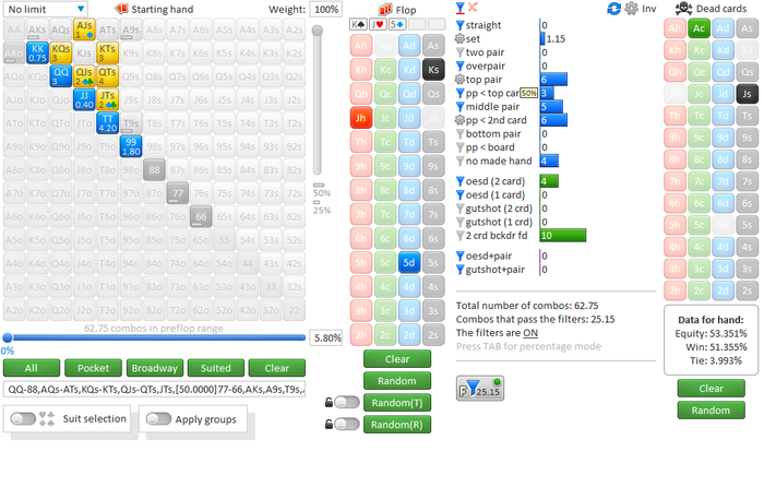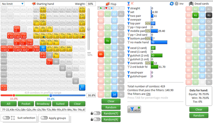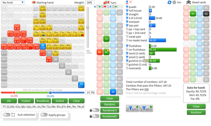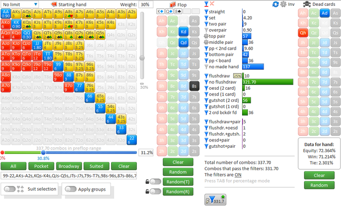 Флоп: думаю ренж изолейта будет чуть шире его открытие , а может быть и вообще весь рендж сьют карт , гадать его рендж надо только богам. Колит примерно 70% диапа isor , в пользу Kx Qx. Донк у него 20% , думаю все Kx в частности слабые K9,K7-K2 будет донкать , остаются гатшоты , фд 25/75 будет донкать , дамы 50/50 донкнет и 8x чекнет и андерпары.