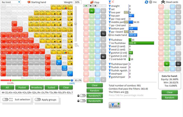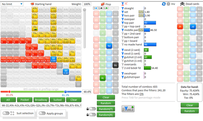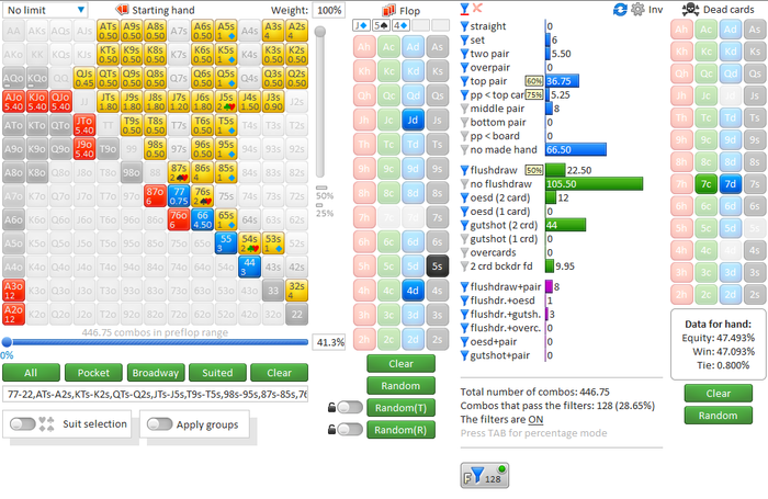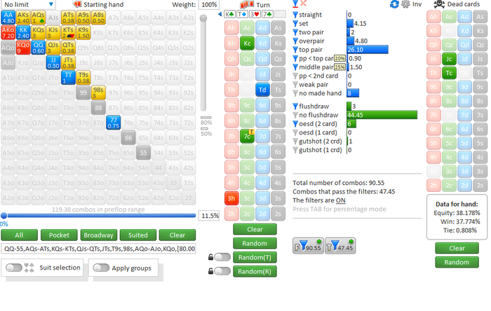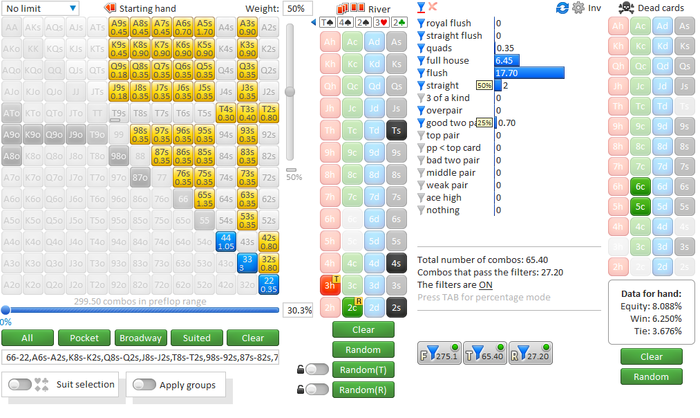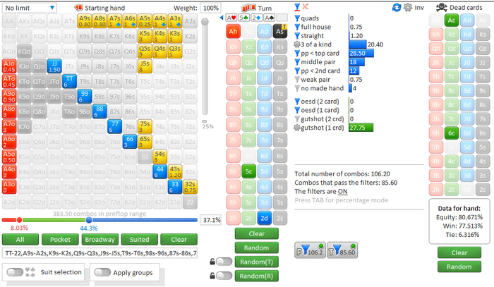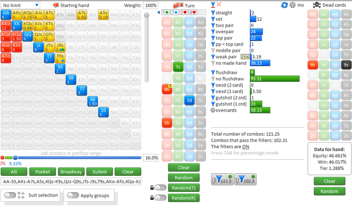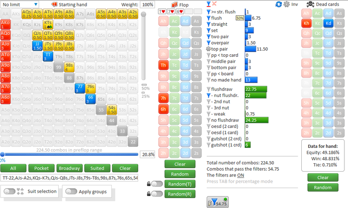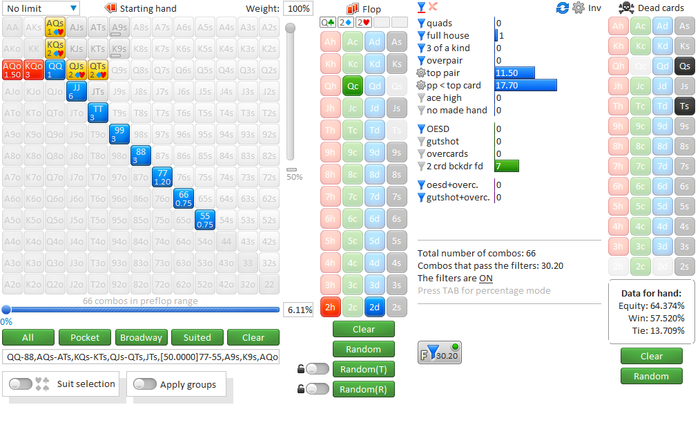 флоп: думаю часть флешей особенно натсовых будет играть через чек , а слабые через бет , велью руки 2п и сеты должен ставить, но мог и чекнуть , ниты такие.