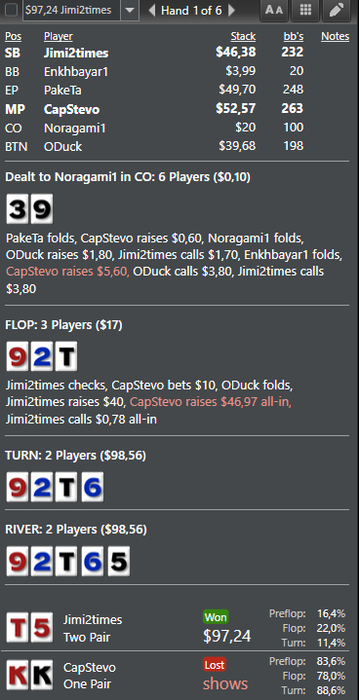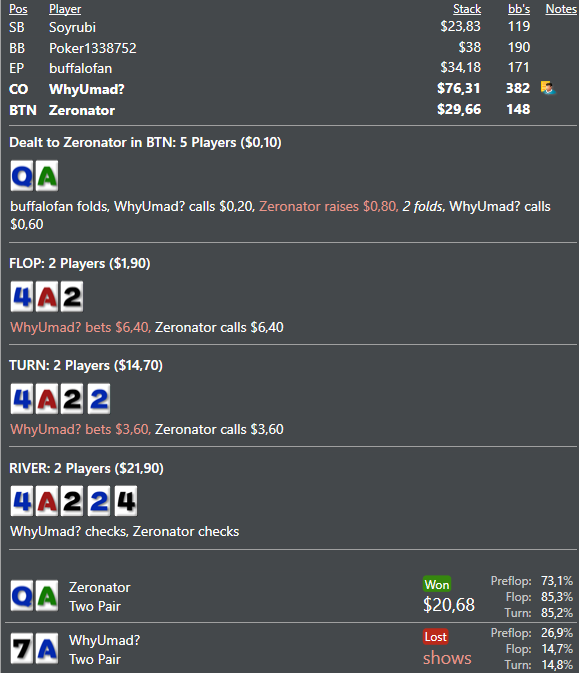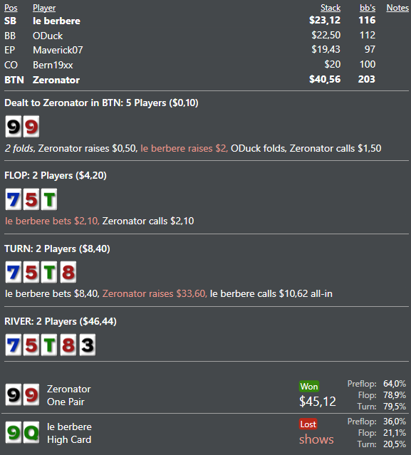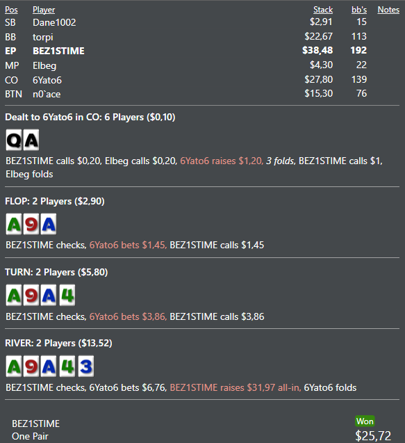Решил играть бет фолд, думаю он не переиграет слабые Ax , прилетел чек пуш , мне как-то показалось что это слоу плей фуллов и слабые ax чисто отколит и всё , сделал большой фолд и опп показал 99, против агро изи колл против пассивного всё равно склоняюсь к фолду