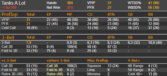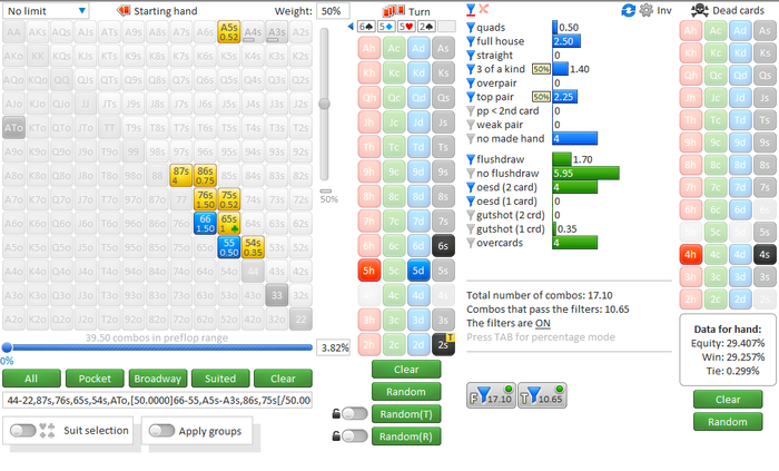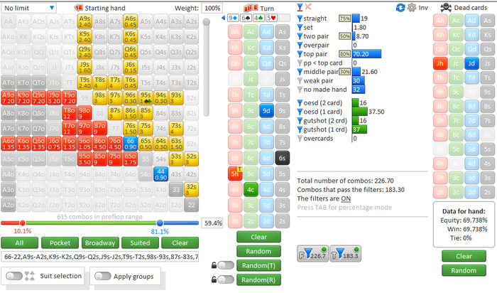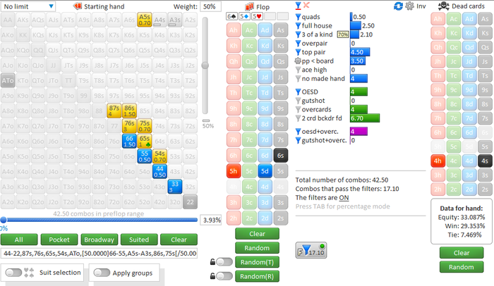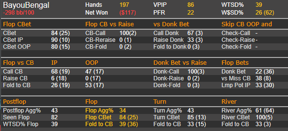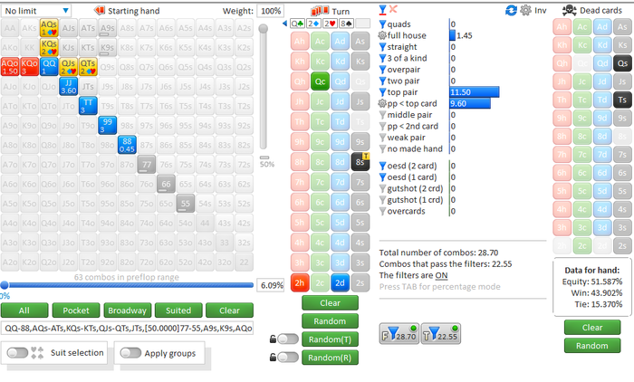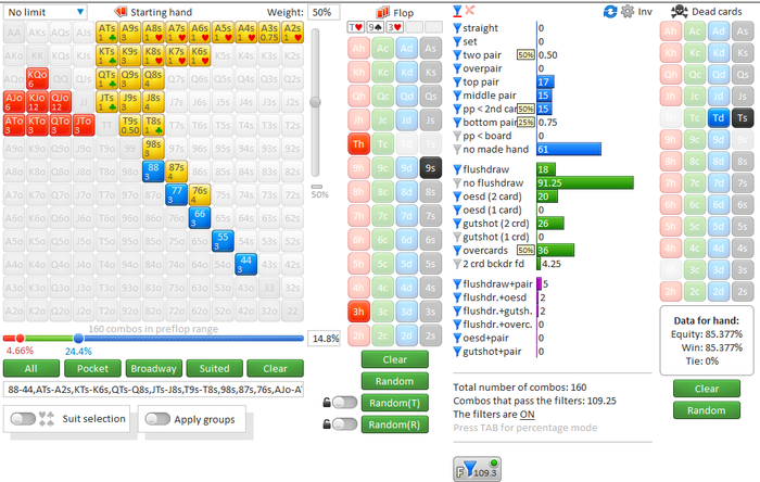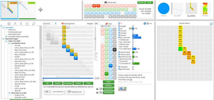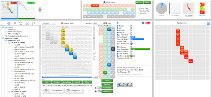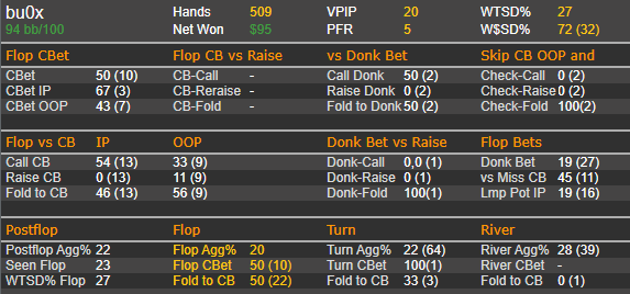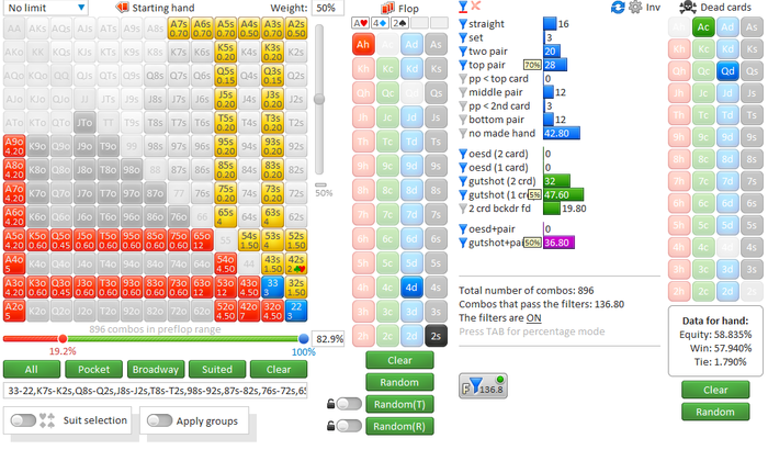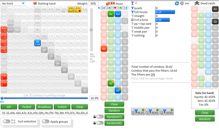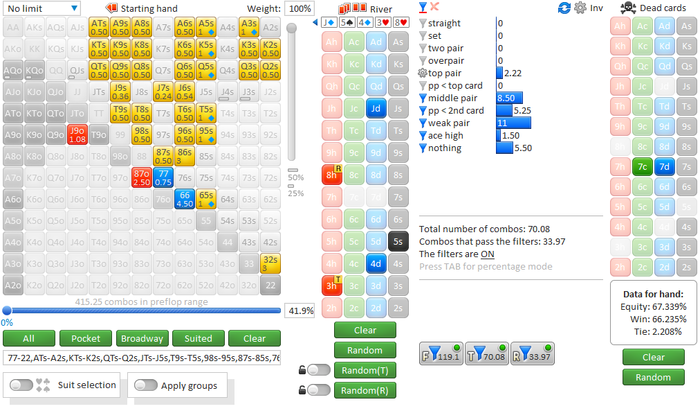 не думал что так много эквити , тут он много переблефует себя с такими цбетами и завышенной агрессией по тёрну, думаю если блефов меньше будет околонулевой допуш будет