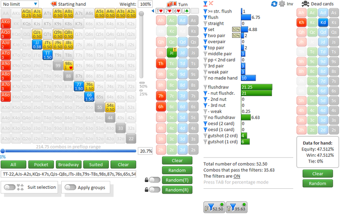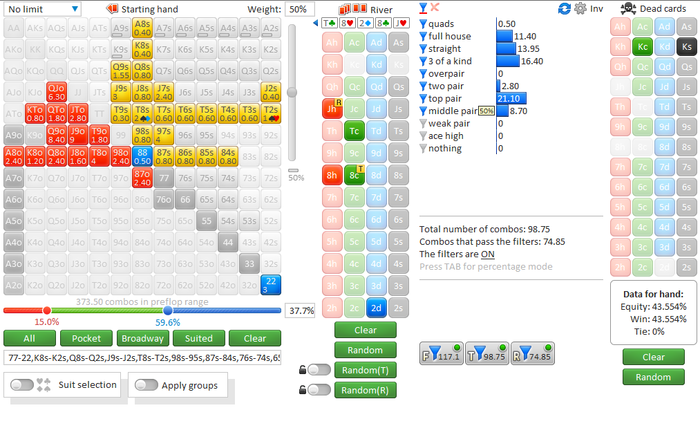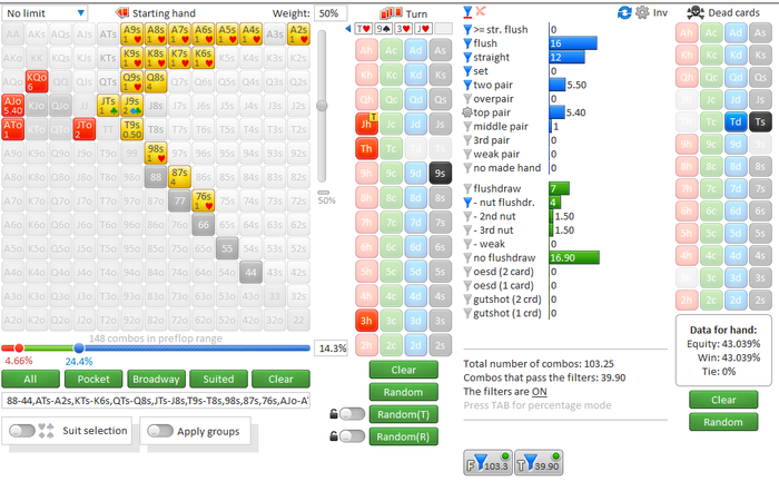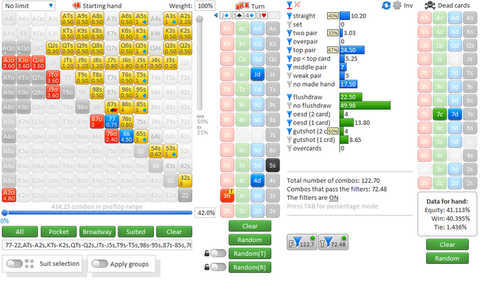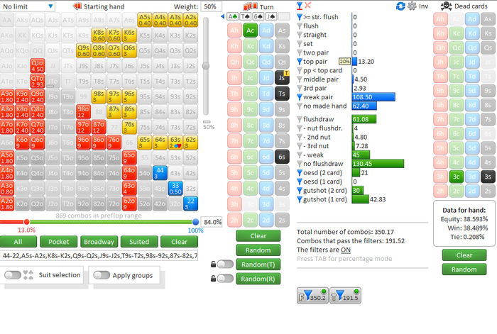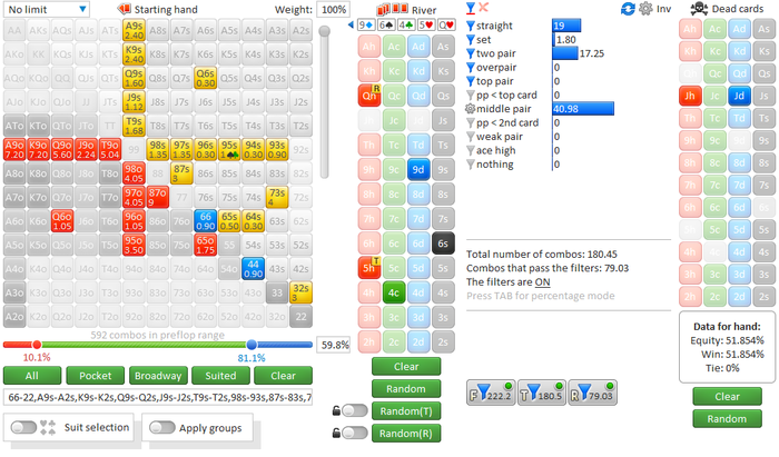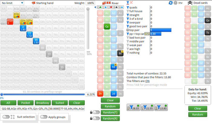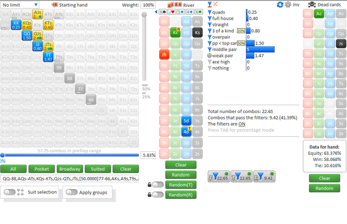 Тёрн: не всё так плохо по эквити как я думал, но я хз надо ли тут допихивать или играть через кол и при любом ран ауте по ШБ мы вынуждены колить , а пушем мы может хоть что-то ,но выбить , но тогда нас колят только стриты флеши.хз крч , надо солвер уже покупать и там решать