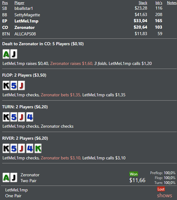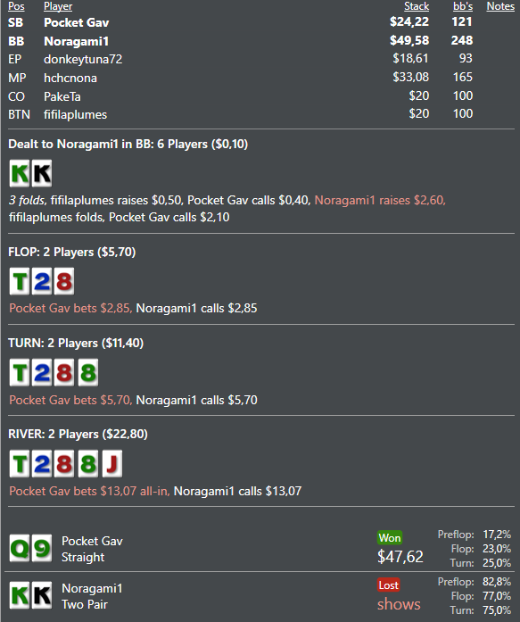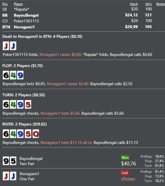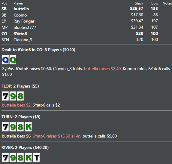 Ривер:ставлю жопу на то что в меня полетит донк с фуллами ТПТК либо чек рейз , рейза мы не увидели , JJ-99 отлично колятся т.к я спокойно могу сделать в блеф 16 комб AK у которых у него просто нету.Велью бета совсем нету увидев KQo такой ЧЁ ты же это фолдишь , но я забыл то что это рыборегуляр и у них нету разницы между KQs и KQo вообщем я думаю есть чек тёрна и бет ривера если так играть либо бет тёрн чек ривер , интересно есть ли тут линия овербета в блокбет от QJ-KQ , бб 40-45 поставить и всё, когда куплю солвер точно разберу раздачу