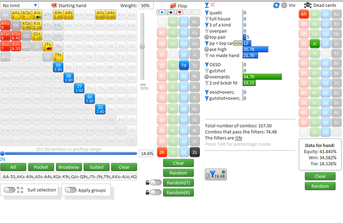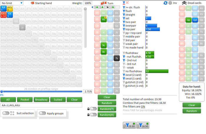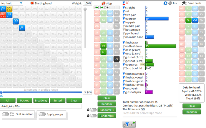 Флоп: ШБ 22%, думаю есть чек рейз чтобы понять где мы, x3.5 рейзом выбиваем думаю 2 комбы jj все AK кроме крестовых, думаю после рейз цбет он пихнёт всё велью кроме jj, остаётся 13 велью комб AA KK AKs , выбиваем 8 комб АК и 1-2 комбы JJ , всё такие тут нужен рейз