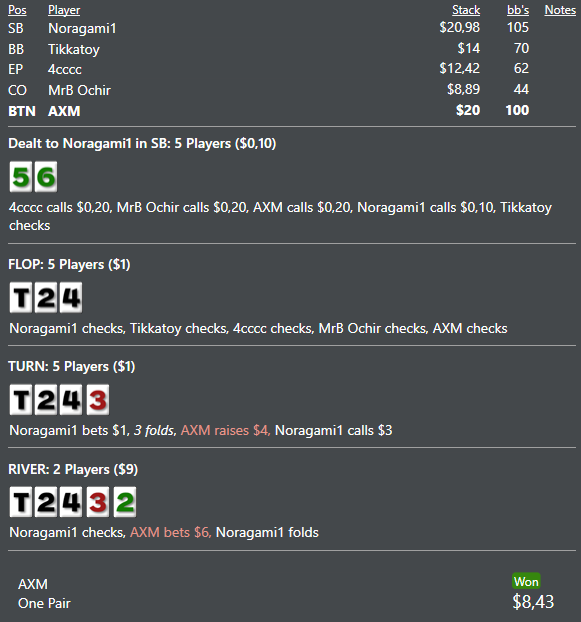 ШБ 33% , у нас за спиной 4.5$ не вижу смысла колла с ФД + пара сразу допихал , пуш лучше бы выглядел с ATs, желательно не колить с блокерами на его полублефы , либо пихать с T9s, раздача спорная не могу сказать что сыграл правильно , парень агрессивный , загнал себя в жопу из-за cc на мп вс нита , 3бет и не париться , а так сделал себе около нулевой-минусовый спот на стек.