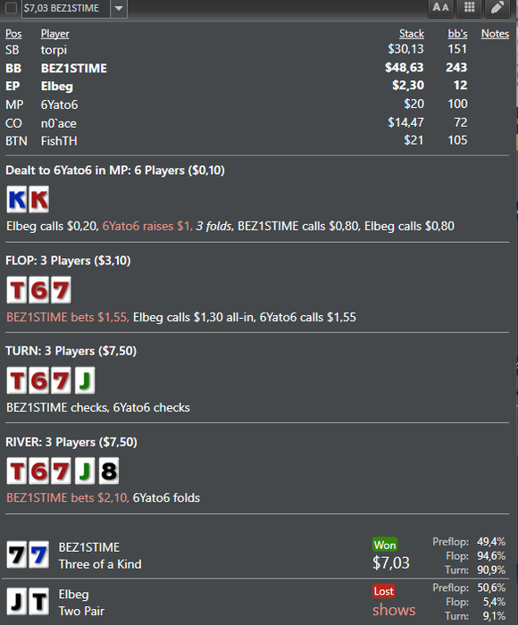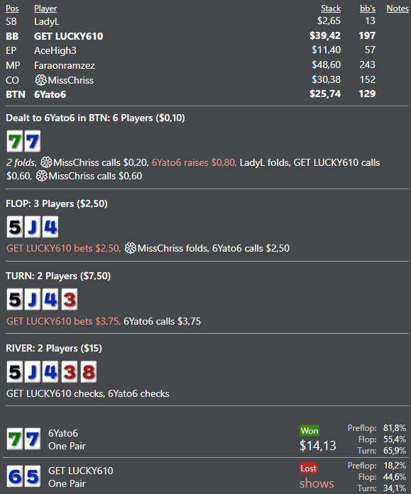 cbet вижу таким, таким сайзом думаю он больше играет неготовые руки и слабые , тп тоже так может играть , но до этого с велью он ставил очень плотно 75%-pot