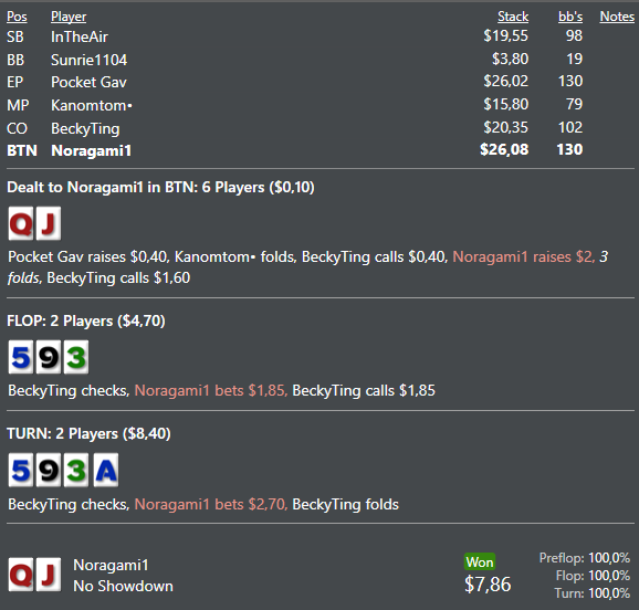 Флоп: доска достаточно сухая , думаю рейзить тут не надо , а вот на второй барель + будет больше дров можно будет.ШБ 25%