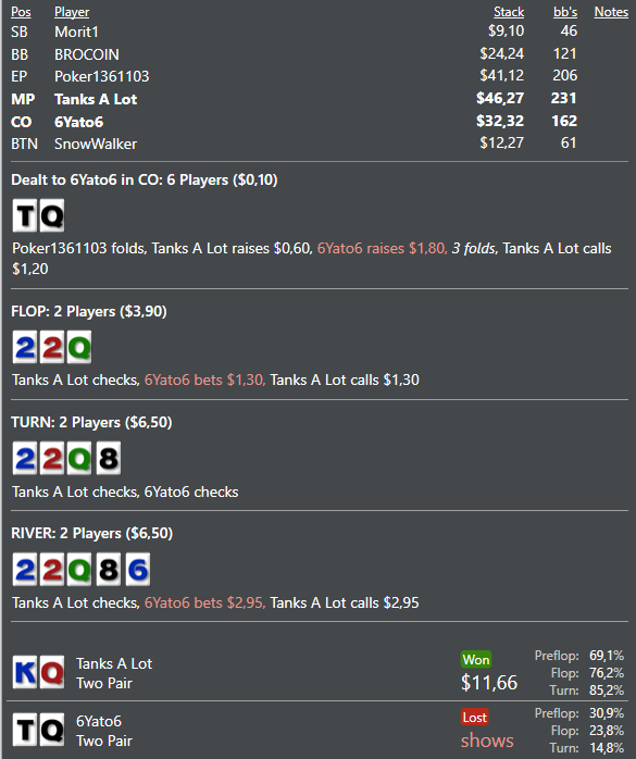 Ривер: вроде доехали , но вроде и слоуплеев достаточно получаем пуш , если оесд мы не выбили , но и пихать прям все он не дожен 50/50 ШБ 36%, думаю можно фолдить на пуш т.к из оесд 1 комба колил оесд+фд, слоуплеев 66 65 будет достаточно , 5x должен был по тёрну рейзить , сам загнал в говно ситуацию , да ещё сфолдить не смог , прожрал весь ТБ , но всё равно вколил...