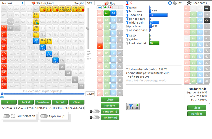 Ривер: почти бланк немного увеличилось комб фуллов и прилетает чек пуш , по комбинаторике подумал что тузов у него всё равно меньше чем у меня и скорее всего это фуллы будут слабые Ax стриты думаю не пихал бы и иногда пары по доске, сложно найти фолд , я его не нашёл думаю тут можно фолдить из-за его манеры игры , то что он нит.