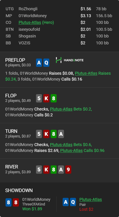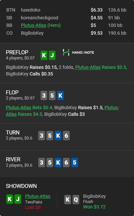 2. Опп вообще телефон. Ну пусть он с 55 залез, протелефонил. Так и не запушил флоп. Тоже нечего расстраиваться. Хотя, я бы терн все же не ставил. Да и флоп еще подумал бы - доска не подходит никому. У оппа оверпары на терне остались после колла (если нет нотсов, типа, что он может 55 завестив 4бет). Сам себя с AK вельюбетишь.