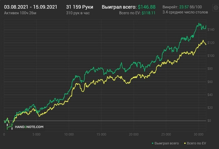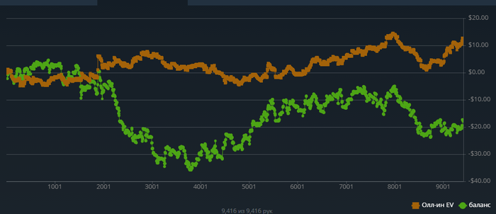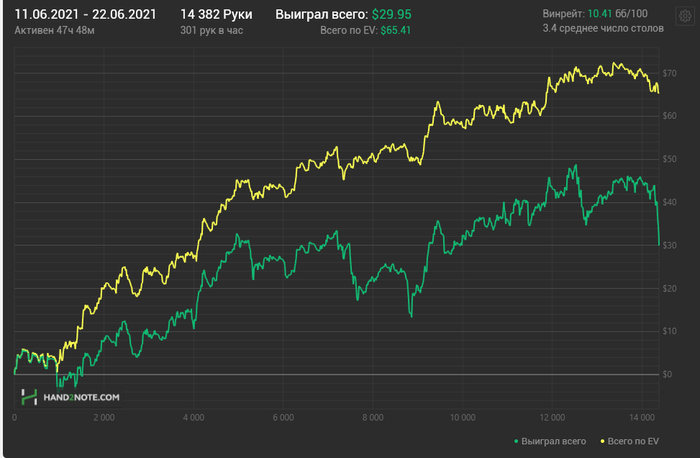 gp2500, оставь ты эту омаху. Все норм. хотя и "График за примерно 10к рук" плохой. Я не смотрю на зеленую линию. с 8000 по 9000 у тебя падение по желтой, видимо тильт. но +12дол по желтой это мало. играешь в 0. а если вычесть и рейкбек то в минус. Радует что катаешь много. Удачи тебе. Я Alara на ГГ. Вот это недобор на нл2 за 1 сессию. Обучаю на Ютуб бесплатно. https://www.youtube.com/channel/UCgtwZ7Xhv50TYbhOREpi5Ew/featured