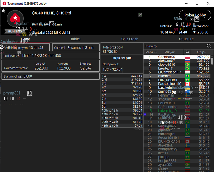 Вообще очень странная система призовых в этом турнире(не только в этом), в призах было 80 человек, мин итм 15$(при бай-ине 4,4, уже странно), за 20-е место давали целых 17$, пейджампы не больше 0,5$. То есть по сути мы имеем сильное ИСМ-давление на баббле, потом катаем ЧипЕВ большую часть итма, а потом сверхсильное давление призовых. Забавная структура, требующая понимание и подстроек в страте.