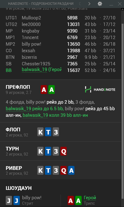 Оба раза поехали немного снизу(против А-хай и 99) оба раза ушатали. Затем была долгая катка, не хотели оппы выбывать раньше положенного, что позволяло мне лузовыми 3бетами наращивать стек. Затем по пути собрав 2-3 нокаута я вышел в ХА с братком-украинцем и, судя по предложению о дележке, очень "хорошим" игроком. Стеки были 2к1 в мою пользу, потом немного подравнялись и в конце концов мы выставились иии...