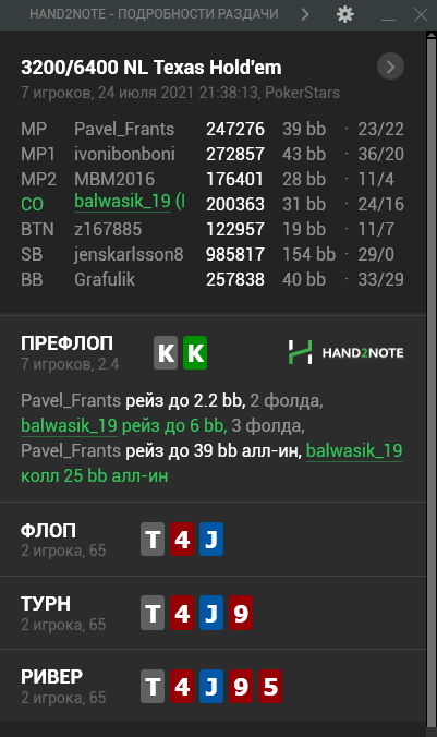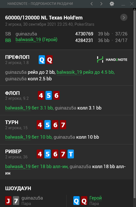 Затем был небольшой простой, немного подслили да и винрейты начали падать и тут случается дежавю. В ночь с сентября на октябрь, опять после рабочей смены(как и в случае с Бигом), опять самый поздний турнир из сетки, но сейчас хоть турбинка, вашему вниманию финалка Hot PKO 4,4. Дикий переап по дороге к финалке. На самой финалке хороший стек, хорошо складывалось, выбил двоих в начале финалки. Потом затишье и снова буря(финалка прям как сентябрь). В 3-максе я стал самым коротким, потащил важную снизу А2>TT, затем забрал его же нок на 60 бачинских и вышел в ХА. В хедз-апе были качельки, опп-фиш, дикий телефон, но опять сутки подряд без сна сказались, хотя до этого играл норм. Все дело походу в ХА, который я не умею играть вообще и действую по чуйке, пытаюсь находить экспоит. По сути развязка была в одной раздаче, которую я сыграл суперплохо, супертильтово, но как оказалось…
