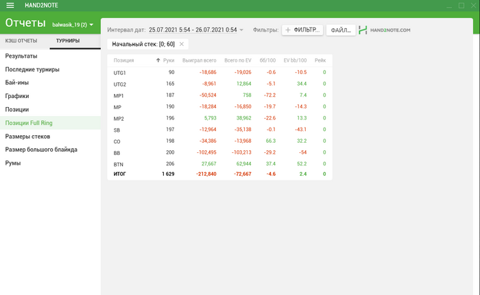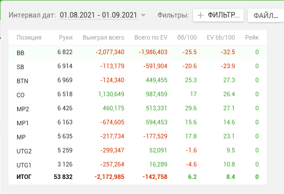 Началась сессия ужасно, решил немного пассивно тузов разыграть(не лимп) и кольнул 4-бет и вшатался в сет королей, выбросить не смог, новичок я еще в этом деле, не разблокировал скилл "фолд АА", хотя на доске QK7 сетов у 4-бетера хватало. Ну в общем минус турик, минус еще несколько, по итогу после двух часов навылетал на 50$ примерно, 0 ИТМ. На дистанции 700 рук стоял -80 бб/100 и -65ЕВбб/100. Просто ужас. Думал уже, что максы до -20 -10бб/100 дотяну наблюдали бы вы такую картину: