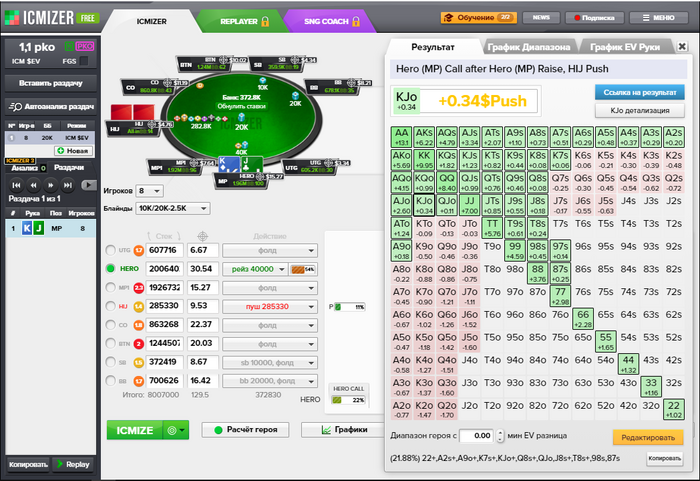 Думаю абсолютно правильно сыграл, в исмайзере раздача не посчитается корректно, потому что у нас опции колла и репуша, а это черезчур мудрено для этой программы. Был ещё дипран в похожем нокауте за 4,4 - тоже вилами по воде.