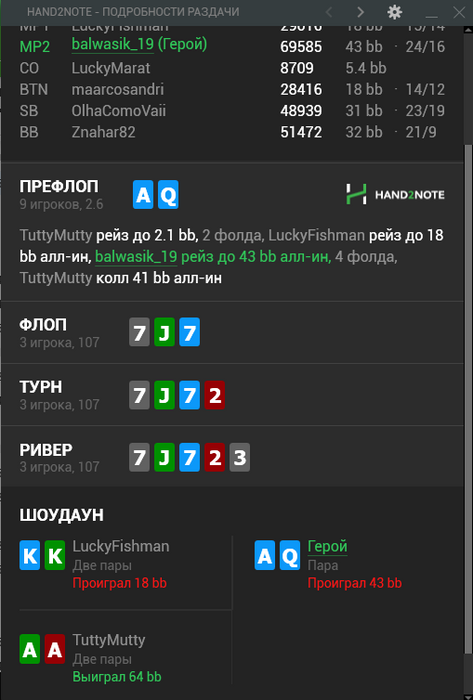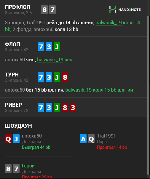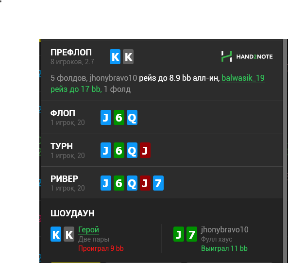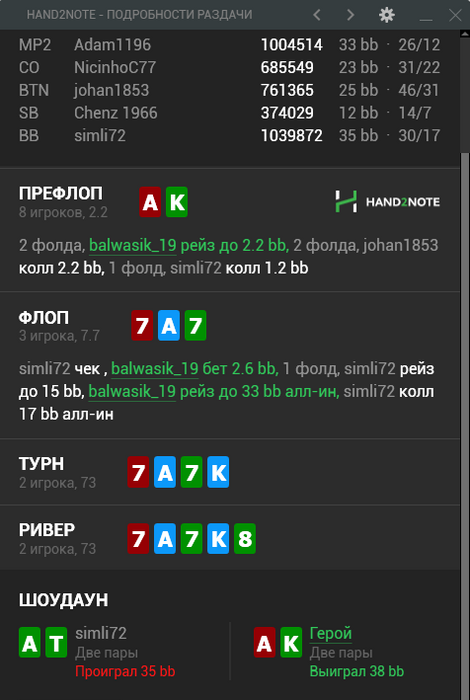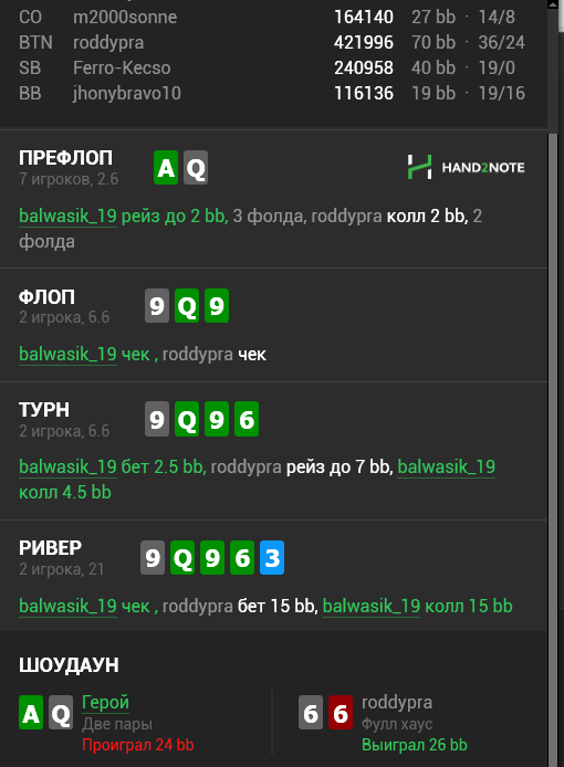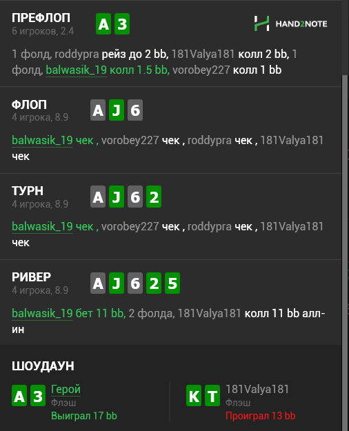 Здесь должна была быть последняя раздача с ХА, но у меня Х2Н не пишет ХА, кароч мои А10о>KQo его.