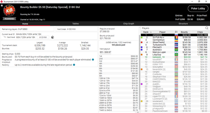 Поудачнее сложилась субботняя сессия, но все равно не удается хоть что-то зацепить в субботних билдерах. Да и в принципе Баунти турниры скатываются у меня в минус, надо бы поработать над этим аспектом, пока все держится на турнирах с малым афс, если посмотреть, то ВСЕ финалки в этом месяце-это как раз таки турниры с малым полем.