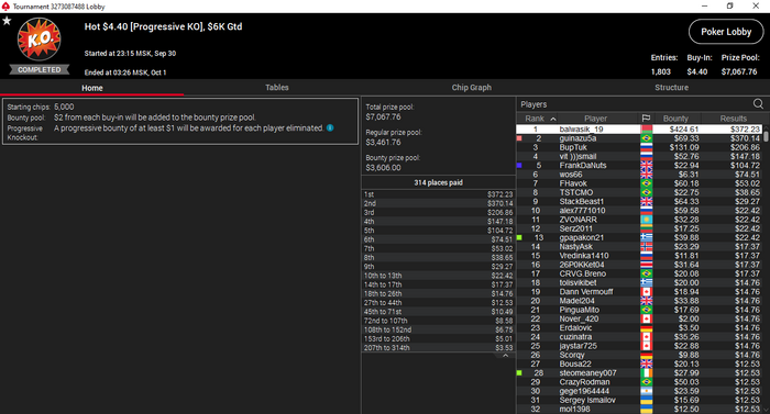 Pokerstars 26 турниров (731,5$>>>660,18$) Профит: -71,32$