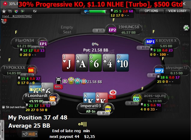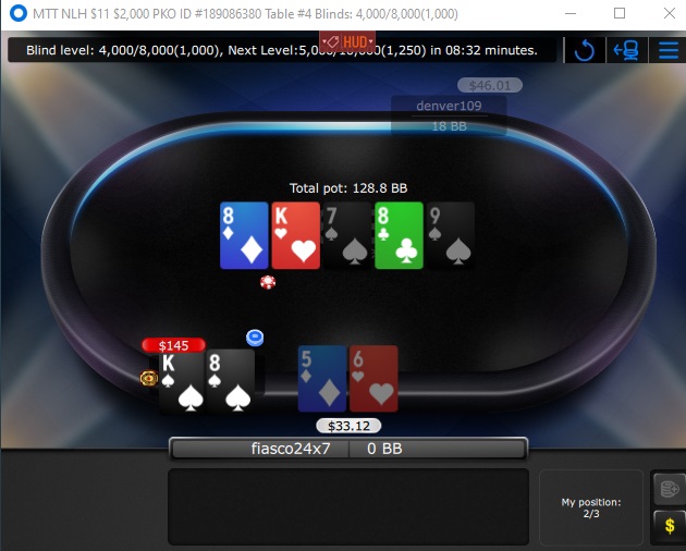В дальнейшем из интересного сегодня вышла одна финалка в турнире по $11 на 888, которая в итоге и спасла сессию. В конце при 3-макс ужасно заходило и в последней моей раздаче было вот это
