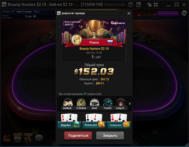 НО тут включается рубильник и я уже хочу продолжать и продолжать, начинается череда побед в монетках и в целом хочу отметить, что эта сессия пока лучшая на этой неделе, ведь наконец-то мы что-то занесли, а конкретно Bounty Hunters $2.10. Не буду скрывать особо усилий не приложил, складывалось прекрасно, хотя пару мелких переездов случилось. Из всех моих румов подкачали и в единственный минус сыграли только старзы.