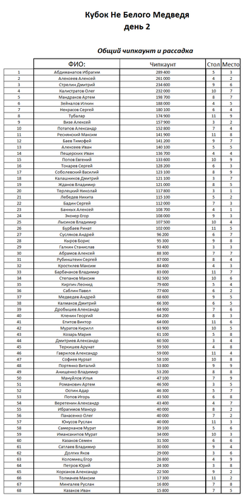 Чиплидером с большим отрывом (порядка 500К) является Кростилев Максим. Его стэк составляет 1,3М. Напомним, что стартовый стэк Максима составлял 6К и он ни разу не докупался🤷🏻♂️ всем кто не верит, что с бесплатного входа можно победить, просьба обратиться за секретом успеха к Максиму.