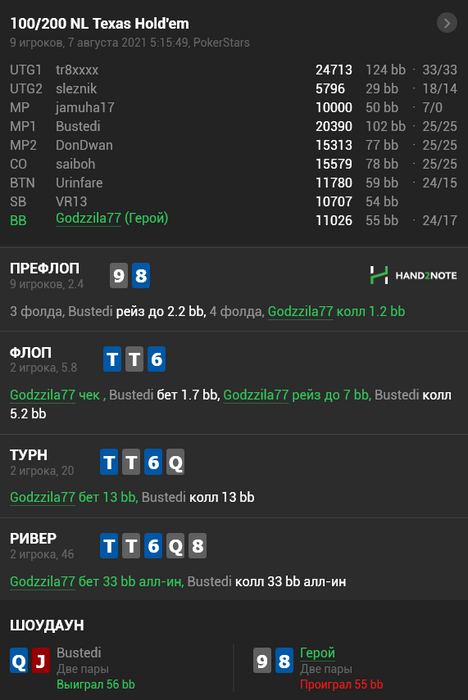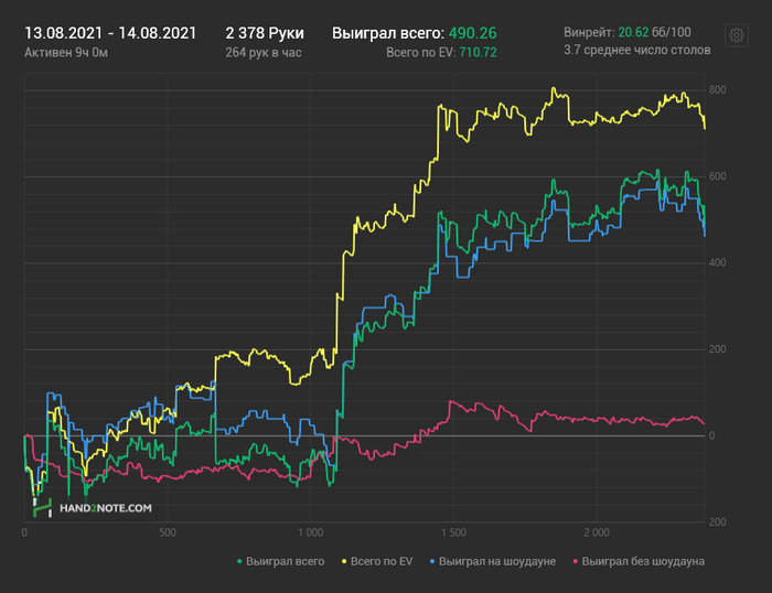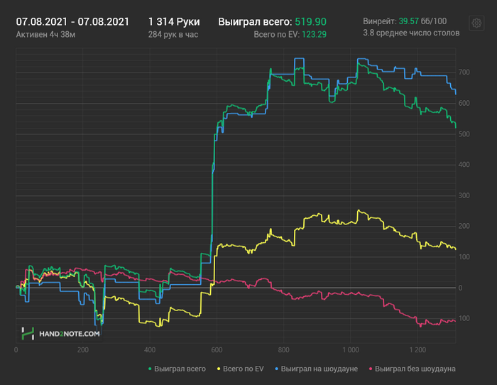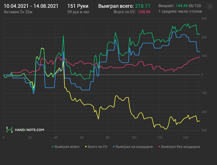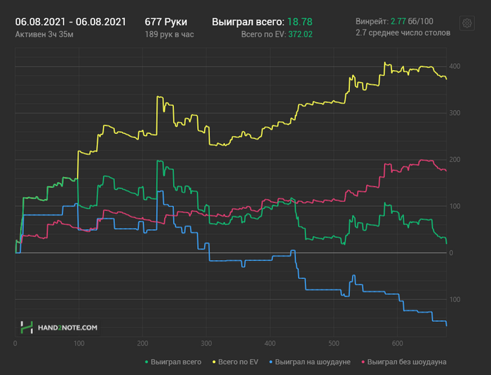 На этой неделе режим решил подналадить, каждый день подъем, отбой как следует, один раз всего встал не по графику. Перед отбоем медитация, планирование и все такое, утром прогулка, медитация. Но все равно тяжеловато по утрам пока вставать. Ну и катать решил более сконцентрировано, не более 6 столов одновременно, и только регулярные турниры без турбо, чтоб диспу не гонять, БР и так слабоват. Достаточно качественно получилось катнуть, "немного" не повезло просто Обидненько конечно, но я все равно доволен результатом