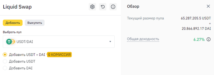 Можно припарковать в пул ликвидности DAI/USDT под 6.27% годовых на Binance. Пул ликвидности стейбл к стейблу хорошем тем, что мы не словим Impermanent Loss и не потеряем.