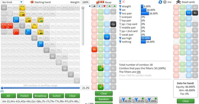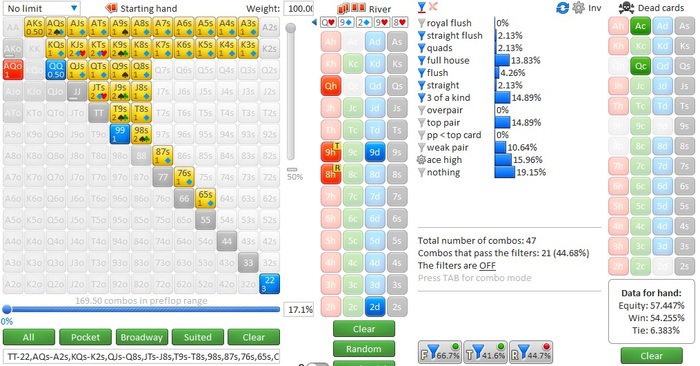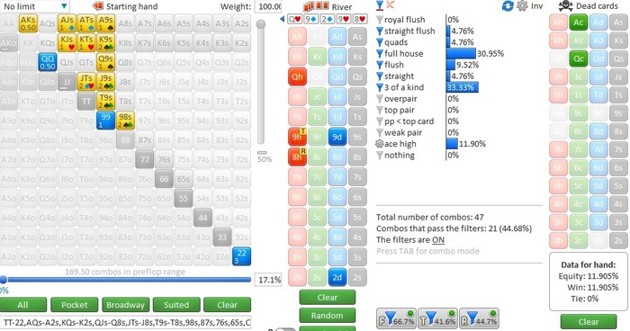 По терну доехал в свой аут решил ставить немного, оставляя его средние руки, типа АК, AJ, доперы, и что бы подогнать СПР к единице на ривере.