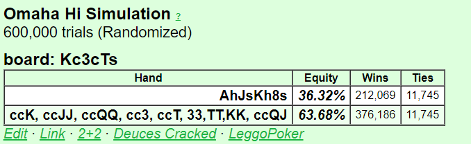 3. Префлоп: префлоп хелпер показывает колл такого сквиза 45% с нашей рукой. Окей. Наверное тогда просто фолд, т.к. это нижняя граница. Но раз уж по нубски залезли в банк - против АА на такой доске 28%. Т.е. на колл не хватает, имплайдов не остается фактически. Фолдим. Прав ли я в своих рассуждениях? Как бы сыграли вы?