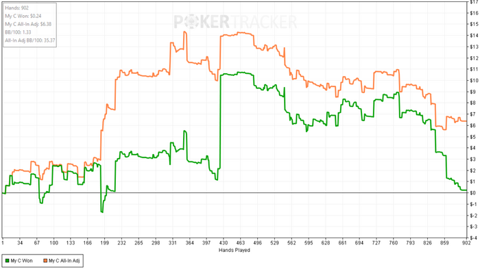 Вообще непонятно что в начале сессии было, попал примерно в 0 флопов. И с АА выставлялся с ребятами 100/94/100 на флопе имея максимум 30%. Потом попустило. Не тильтанул, что радует.