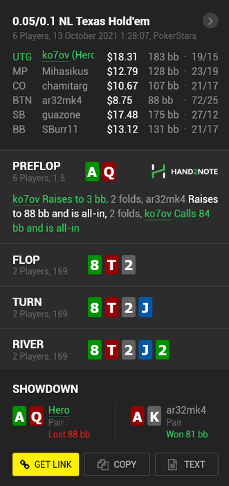 Такая херня, а не сессия вышла просто пиздец, тупо сидел афк карты в пас выбрасывал. Ебаный фр. Но закончил в +25, ещё с челленджа 10 баксов накинули — приятно. Из интересных раздач: