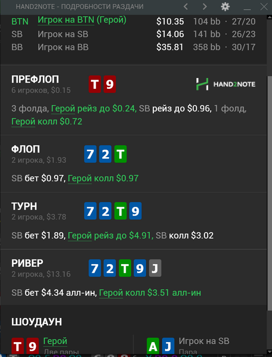 BTNvsSB, я ловлю один из подходящих мне бордов и должен защищать своё эквити ( в голове была мысль рейза, чтобы выбить как раз такие руки как у него), только вот этот рейз нужно делать на флопе, тут не знаю почему я нажал колл, по сути это всё портит. В итоге по выходу 9ки я такой: "Ну всё, щас точно рейз" не смотря на спр, не смотря на то что закрылось фд. Раз мы совершили ошибку на флопе, то на терне либо пуш либо колл. Не выйди там 9ка, я бы фолд прожал на терне. Нужно извлекать именно из таких раздач урок, что маленькая ошибка на одной улице может привести к проигрышу стэка. Не смотря на то, что я тут вышел победителем.