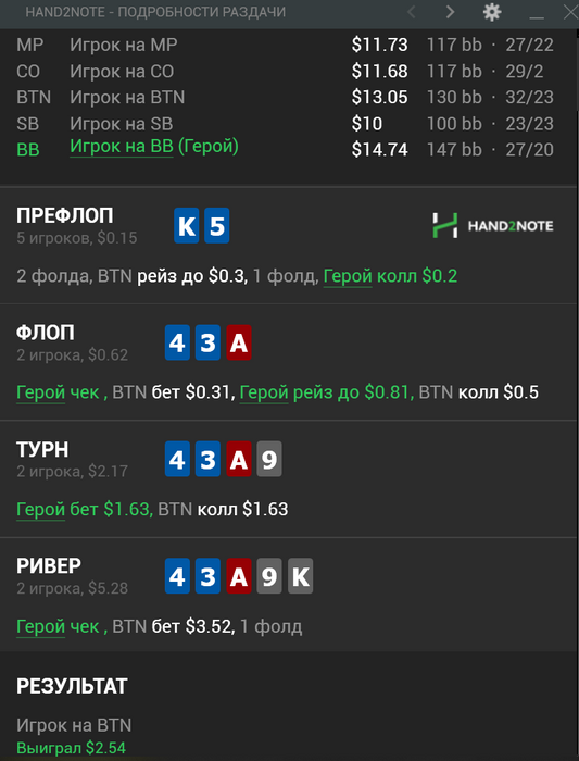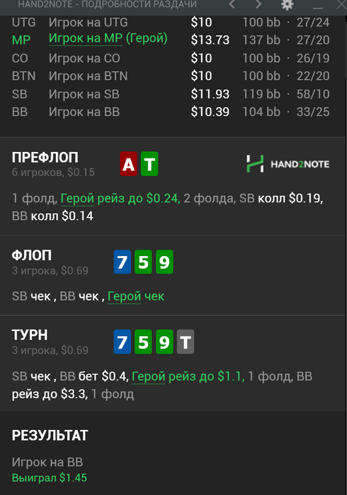 К этой раздаче ещё вернёмся, потому что думаю, тут многое зависит от оппонента и его статистики. С этим я ещё не совсем хорошо разобрался.