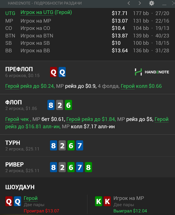 ukuwutebya, привет, мне кажется ты во второй раздаче усложнил себе игру коллом QQ на еп, я бы эту руку в 4бет уводил. Тебе неприятно будет потом без позы смотреть на A, K, J high или скоординированные фд флопы.