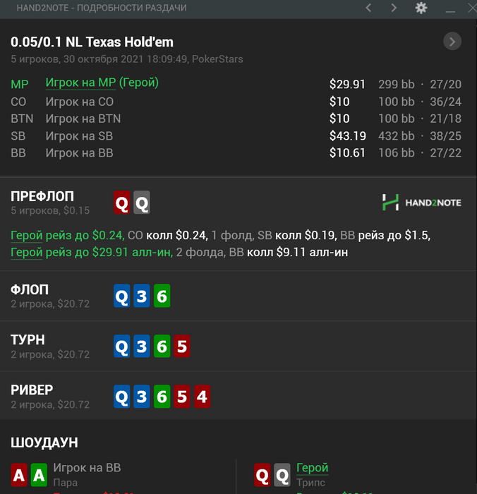 По поводу пуша в сквиз нужно смотреть на его статки трибета и сквизов, не думаю что у оппа 27/22 они будут сильно заниженные. Попробуй ответить себе на вопрос какая опция с QQ лучшая. Фолд? А нахуя? Колл и создание мультипота? А зачем? 4бет? А как себя дальше опп поведет без позы?