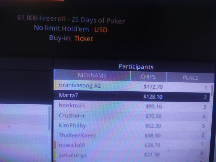 Зима пришла неожиданно как всегда первого декабря и принесла много не неожиданностей ну игра пошла потихонечку в гору но вот и сказка .Дело было ночью после хороший сессии я закрыл столы и ждал когда деньги вернутся в кассу вышел по делам и пришло время спать и тут открылся стол я подумал может с очереди какой не вышел но нет стол оказался турнирный и участников 300 человек и призы денежные думою ну ладно попробую зная свой фарт в турнирах вылечу быстро все как всегда приходят АА и все я вылетел ну так было последние время ну нет сидел играл аж до утра и сам выигрывал у сильных рук и дошёл до второго места вот такие зимние чудеса .