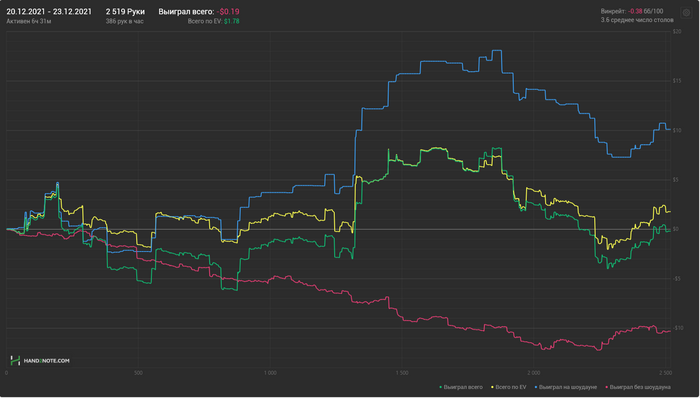 2. Попутешествовал по Румам (Редпокер, ГГ, Старзы), поиграл разное количество столов, от 1 до 12 - решил , что сейчас оптимальное число - 4, до конца года буду играть именно такое количество и буду играть на старзах. Больше всего сыграл на ГГ график ниже. В общем за неделю вышло порядка 3к рук.