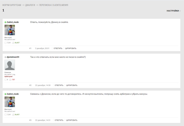 Я не видел сообщений на Джипси, как уже писал ранее редко сюда заходил, думаю по-моему акк видно ( не активный пользователь). Не знаю что там есть за записи у модератора, ну пусть скидывает , нестрашно, если не отфотошопят=) может и заходил почитать какую-то тему. То что я писал про бекинг это уже всем известно, что я собственно и признал. Хочу уточнить момент, вы попросили Дениса, что бы он написал мне в скайп, он написал про то (почему я пытаюсь возобновить игру ) и ты говоришь, (что ты потом спустя время написал мне на Джипси и я не отвечал 20 дней) и ты пишешь Денису что кидаешь мне арбитраж и в этот же момент, Денис удаляет сообщение а месяц не удалял? Скрин перед этим сделать нет? То есть в скайпе я не отвечал по твоим словам и не видел сообщение почти месяц? Невозможно! При том что в скайпе я сижу и отвечаю достаточно быстро и часто. Но даже если все эти объяснения были бы и правдой, все бы хорошо кроме одного, ты говоришь это не обязанности были Дениса решать вопрос и вы не хотели втягивать его в это уже, и Денис этого не хотел, тогда вопрос, после того как ты кинул мне арбитраж, я тебе в чат Рома ответил, на Джипси ( как на твоём скрине выше ) и ты снова скинул все на Дениса, что бы я ему писал и с ним решал вопрос, зачем ? Сам себе противоречишь получается, лукавишь ( а точнее говоря вроде как не особо ты за Дениса и переживал в тот момент ) зато переживаешь сейчас за себя и свою репутацию. Да вы меня удалили в дискорде сами, и только по этому ты не смог мне написать и попросил Дениса? Так что, ты не мог взять скайп мой у Дениса и самому мне написать, раз уж на то пошло ? Зато лепить мне арбитраж, ты нашел как, а потом спихивать все на Дениса, что он удалил сообщение, нормально согласен. Меньше всего я хотел Дениса сюда втягивать, но это сделал ты, своей ложью, а не я. Говоришь, очевидно что вам хотелось решить этот вопрос без арбитража? Я верю что Денису хотелось, но не верю что тебе.