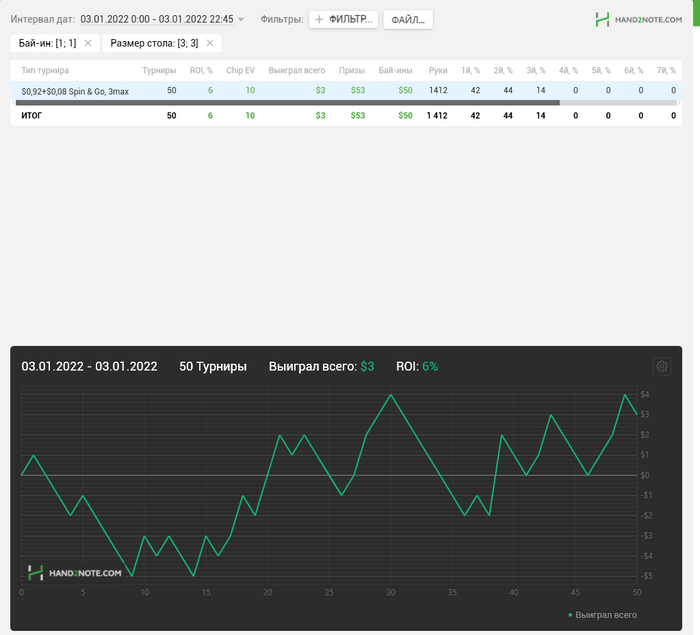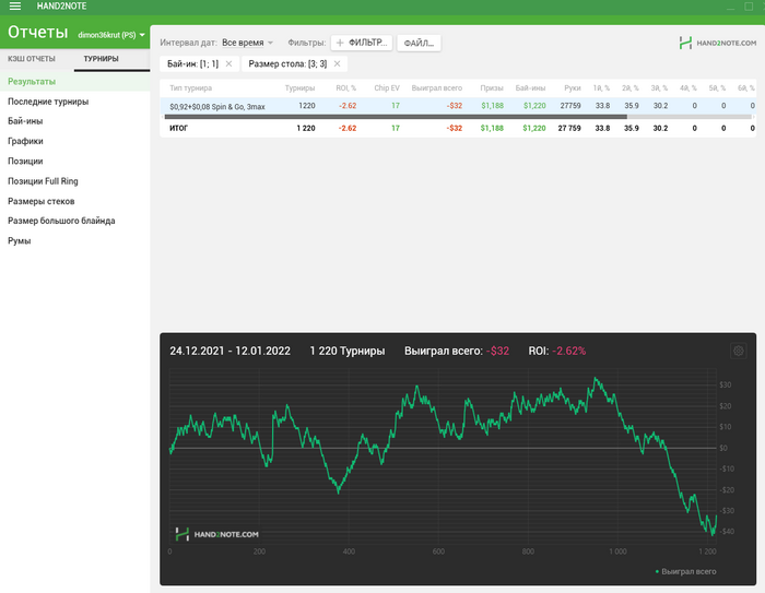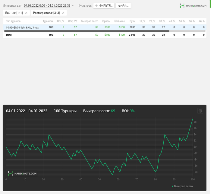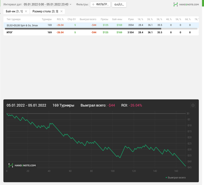 Снова минус, в начале сессии был в загрузке на шесть спинов и у меня завис ноутбук, перезашел с телефона и кое-как доиграл турниры что остались, короче сразу день не задался, со спинами беру паузу, может на один день, а может и бессрочно, сегодня катну немного МТТ на остаток БРа, ни на что не надеясь, но качаться на этих качелях в спинах по баксу - желания пока нет. Да, на единичках можно иметь около 150$ в месяц, катая в два раза больше чем я, но этих денег на жизнь не хватит, я на фрироллах на 888 столько же примерно в месяц делал, да и в МТТ мое ожидание куда больше чем здесь. График скину общий позже, как только Стразы отправят историю рук, т.к. что с телефона доигрывал на компе не сохранилось. Вывод: плавать в говне микролимотов не хочу, буду искать работу и копить на нормальный БР для МТТ. Всем гудлак!))
