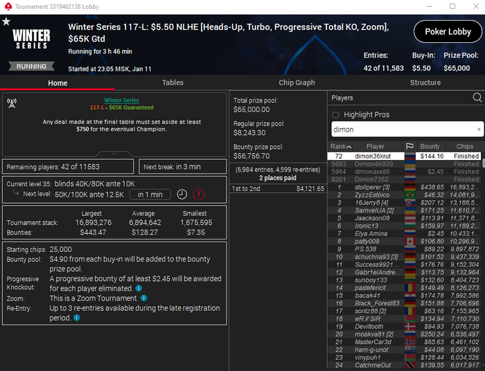 Вполне ожидаемо - остатки БРа проёбаны. Я еще умудрился сделать несколько кэшаутов. Кстати, я хоть и играл не по БРу, но в МТТ вполне хорошо складывалось, хоть и не было не одной финалки за это время, если бы не выводил $, и не подключал спины, то вполне мог дальше катать. Сейчас нахожусь в активном поиске работы. Буду катать фрихи, и строить БР для МТТ.