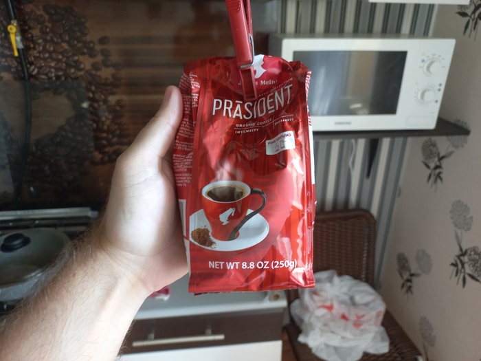 Мясо, сыр и кофе. Еще у меня были свежие огурцы, но я забыл их достать из холодильника.
